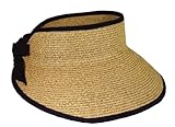 Capelli paper braid roll-up sun visor by Dorfman Pacific with 4 inch brim, ribbon sweatband, contrasting cotton trim and elastic closure with bow tie. This sun visor is packable and great for travel.